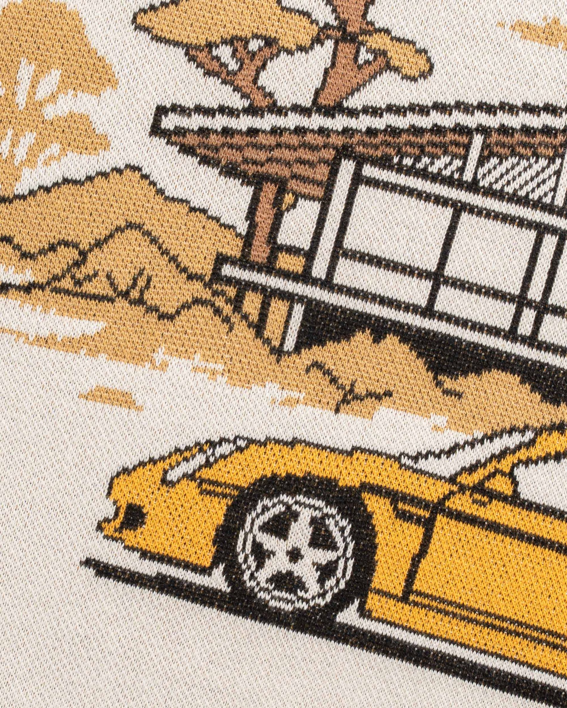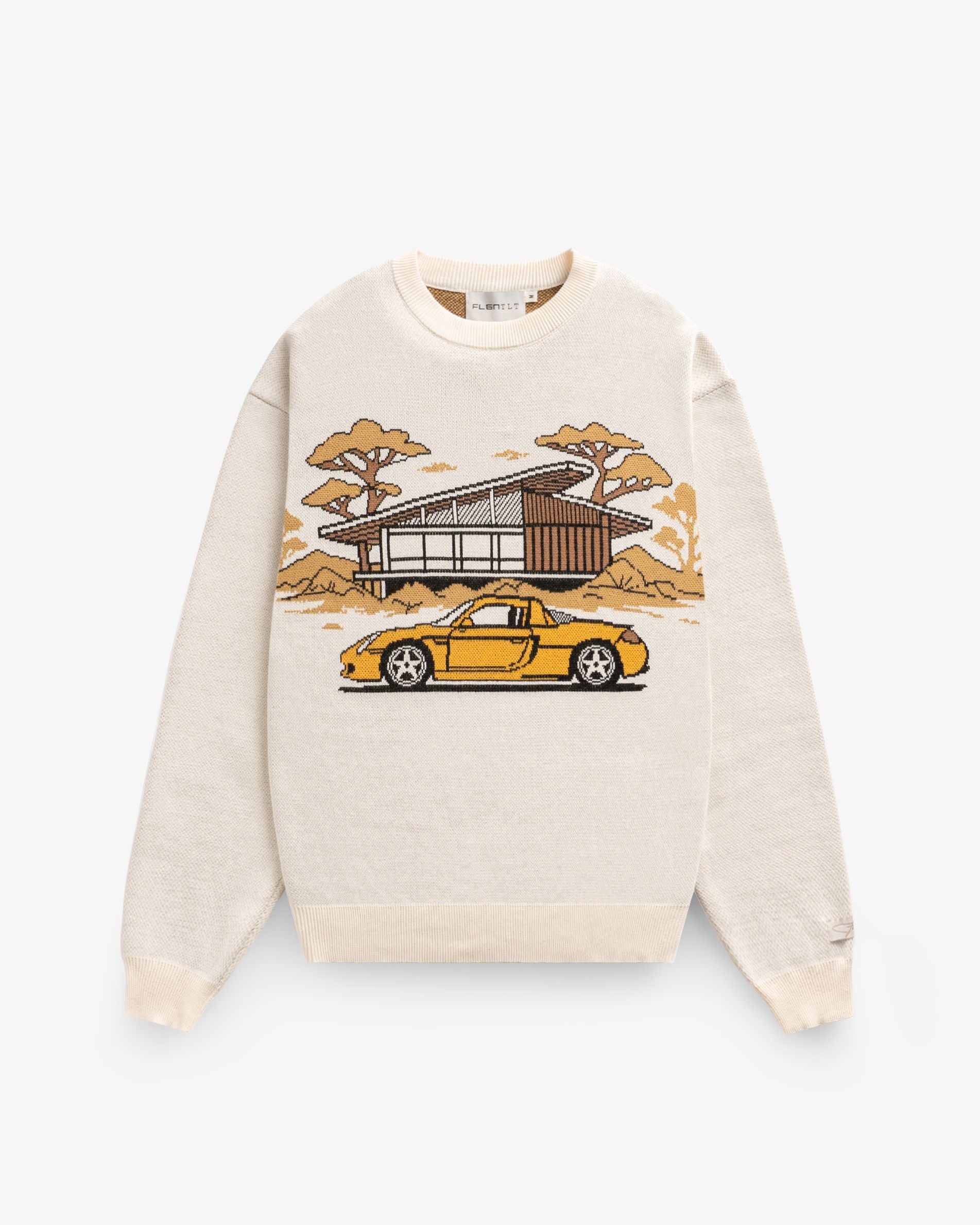 Der Knit Sweater Century ist als klassischer Picture Knit umgesetzt. Das Frontmotiv ist vollständig eingewoben und zeigt die Silhouette eines Mid Century Hauses mit großzügigen Glasflächen und klarer Geometrie, davor ein gelber Carrera GT als präziser Kontrast. Architektur und Fahrzeug werden nicht gedruckt, sondern Teil der Konstruktion. Gefertigt in einem hellen Creme Ton bildet der Sweater das zentrale Statement Piece der Art of Living 2026 Kollektion.
